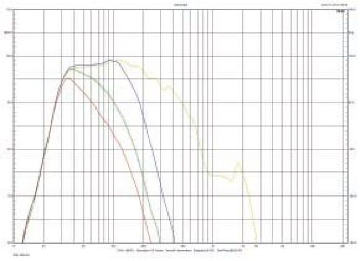 Regulacja w obydwie strony przekracza granice pasma przenoszenia! Ja wiem, że Chuck Norris szybciej stoi, niż ja biegam... Fakty są następujące: częstotliwość fi ltrowania, odmierzaną spadkiem -6 dB, możemy przesuwać płynnie od 65 Hz (charakterystyka czerwona) aż do 160 Hz (niebieska), poprzez 90 Hz w pozycji środkowej pokrętła (zielona); dodatkowo w trybie LFE (żółtozielona) możemy sięgnąć aż do 400 Hz.