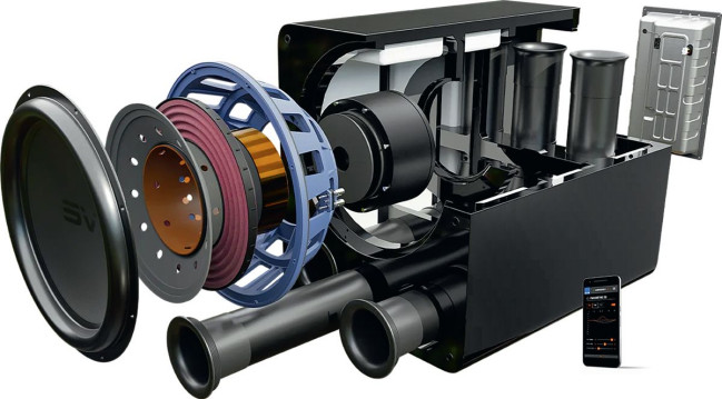 Membrana jest oczywiście bardzo sztywna, a o jej masę nie ma się co martwić… gdy napęd jest odpowiednio silny. Wzmacniacz (łącznie dla obydwu cewek) ma moc ciągłą (RMS) 2800 W, a w impulsie – aż 6000 W.