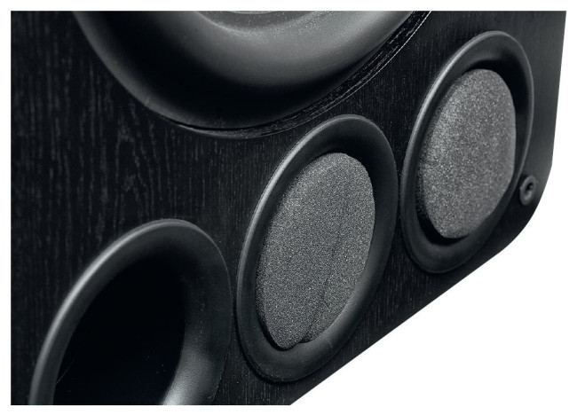 Czy objętość nie jest wtedy za duża? Niczym to nie grozi, charakterystyka sięgnie nawet nieco niżej (niż z odpowiedniego modelu SB). Co więcej, możemy zamknąć nie wszystkie, ale jeden albo dwa otwory, i tym sposobem regulować działanie bas-refleksu akustycznie, a nie elektronicznie. Takie eksperymenty nie popsują wcześniej przygotowanego dobrego zintegrowania z kolumnami głównymi, oddziałują na sam skraj pasma i mogą być pomocne w dopasowaniu do warunków pomieszczenia, gdy system korekcji akustyki nie jest jeszcze gotowy.