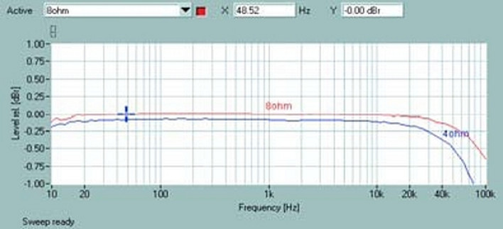 Pasmo przenoszenia P1 (rys. 1.) jest bez zarzutu, przy 100 kHz, dla 8 omów spadek wynosi -0,6 dB, dla 4 omów -1,6 dB, w zakresie niskich tonów wzmacniacz daje sobie doskonale radę niezależnie od impedancji.