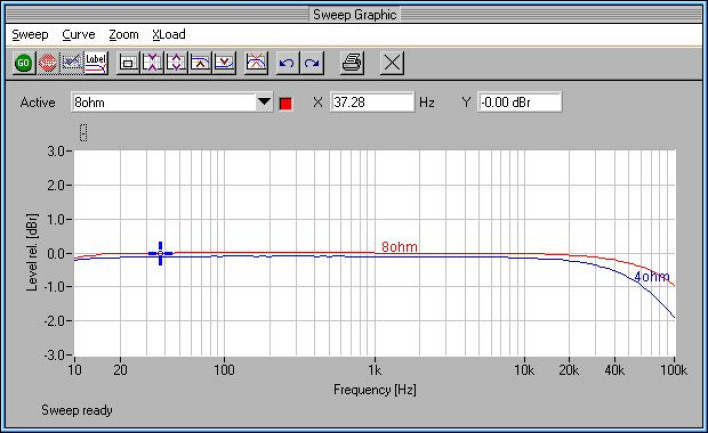 W zakresie niskotonowym (rys. 1) widać zbieżne i znakomite (-0,1 dB przy 10 Hz) zachowanie dla obydwu obciążeń, w zakresie wysokotonowym ujawnia się lekka przewaga pracy na 8 omach, przy 100 kHz poziom wynosi -1 dB podczas gdy dla 4 omów jest to ok. -1,9 dB.