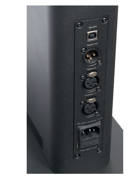Wejścia są zarówno analogowe (XLR), jak i cyfrowe (AES3, czyli cyfrowy XLR), jest też cyfrowe wyjście w tym formacie potrzebne do tego, aby sygnał cyfrowy przesyłać łańcuchowo (do źródła podłączymy jeden głośnik jednym kablem, a do drugiego prześlemy sygnał z pierwszego). Wtedy musimy jeszcze zdefiniować, który głośnik jest lewy, a który prawy, co robimy jednym z przełączników.