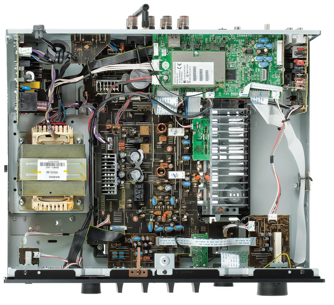 Budowa Yamahy przypomina w dużym stopniu wzmacniacz stereo, radiator jest niewielki i ulokowany w centrum, chłodzi tranzystory Sankena (para na kanał). Na oddzielnej płytce znajdują się regulatory powiązane z filtrami (barwy, kontur) o przeciętnej jakości, ale w sukurs przychodzi przecież układ Direct. Zasilacz bazuje na dużym transformatorze rdzeniowym.