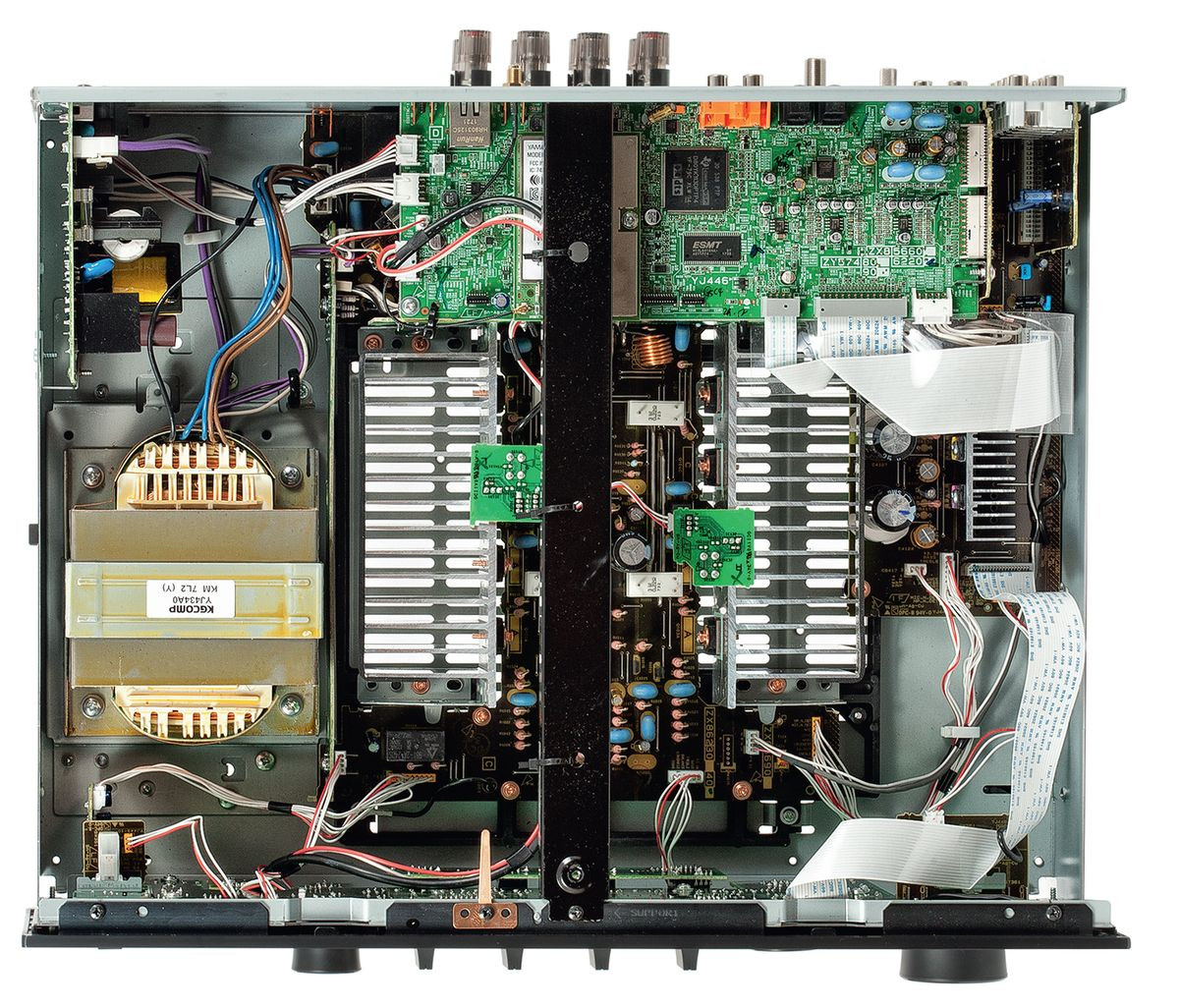 Wnętrze Yamahy RN803D wygląda bardzo porządnie, podobne układy Yamaha stosuje w swoich najlepszych wzmacniaczach. Końcówki mocy są złożone z elementów dyskretnych (dwie pary Sankenów na kanał), zebrane w dwa niezależne bloki - każdy z własnym radiatorem. Liniowy zasilacz bazuje na transformatorze rdzeniowym. W tylnej części zainstalowano sporą płytkę cyfrową.