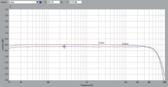 Charakterystyki przetwarzania wyglądają doskonale (rys.1). Spadki przy 10 Hz są nieistotne, a przy 100 kHz ok. 3 dB dla obydwu impedancji.