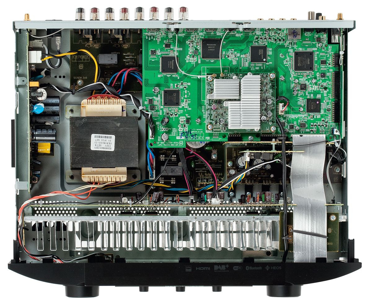 Rozplanowanie wnętrza i tym razem nawiązuje do amplitunerów wielokanałowych, widzimy też rozwiązania znane z innych modeli serii NR. Na sporej płytce cyfrowej umieszczono układy wideo i część obwodów audio, jest też (w formie dodatkowego modułu) sekcja bezprzewodowa.
