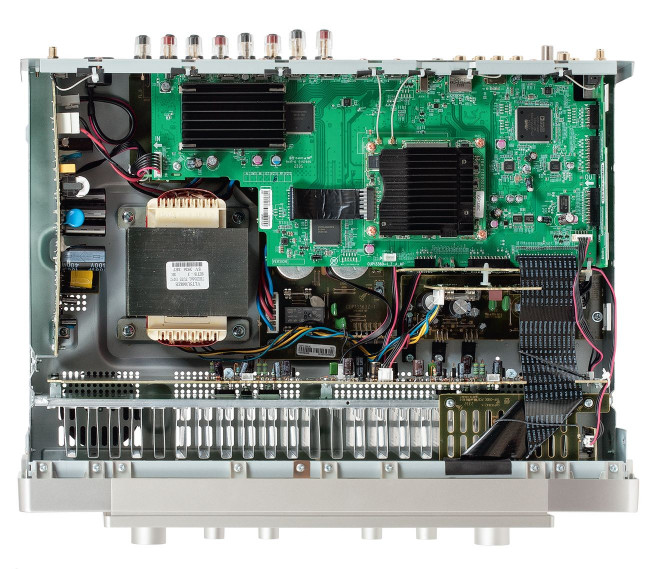 Duży radiator z przodu jest obsadzony tylko dwoma parami tranzystorów, tym razem trudno jednak ustalić ich typ. Pewne różnice widać też w zasilaczu, co ostatecznie przekłada się na nieco niższą moc Marantza od Denona.
