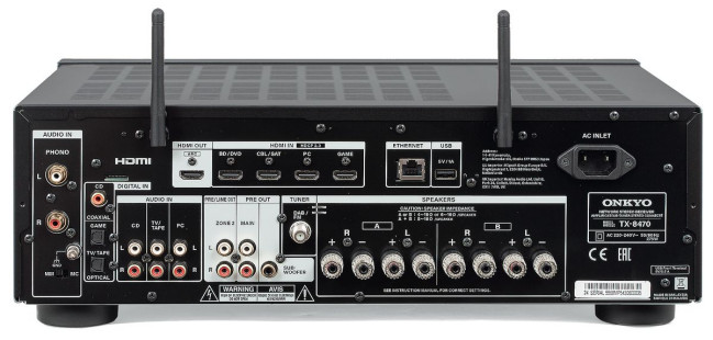 W panelu podręcznym jest tylko USB (do nośników pamięci z muzyką). Także wygląd tylnej ścianki nawiązuje do amplitunerów wielokanałowych. Zaciski głośnikowe są oczywiście "tylko" stereofoniczne (dwa komplety), ale ponad nimi umieszczono nowoczesną sekcję HDMI z czterema wejściami i jednym wyjściem; każde obsługuje sygnały 8K, a wyjście ma kanał zwrotny ARC.