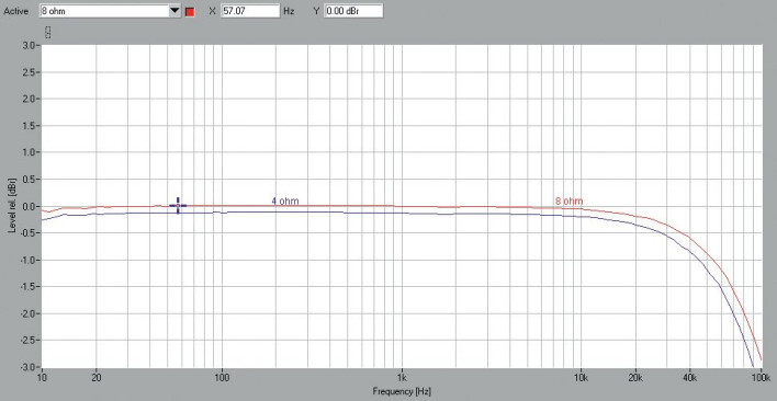 Charakterystyki częstotliwościowe (rys.1) prezentują się dobrze, przy 10 Hz nie widać żadnego spadku, w zakresie wysokich tonów (już w zakresie ponadakustycznym) spadek -3 dB notujemy przy 100 kHz dla obciążenia 8-omowego i 90 kHz dla 4-omowego.