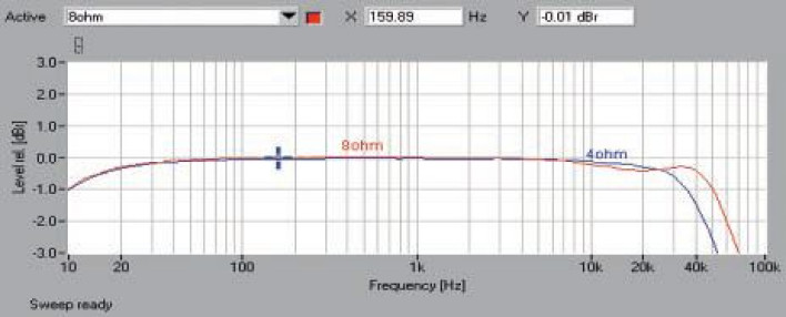 Na pasmie przenoszenia (rys.1.) widać, naturalne dla konstrukcji w klasie D, drobne problemy, wynikające z pracy fi ltrów wyjściowych. Dla obciążenia 4-omowego charakterystyka delikatnie opada, przy 8 omach widać wahania. Jeśli jednak przymkniemy na nie oko, to spadek -3 dB przypada na 70 kHz, a dla 4 omów na 52 kHz; przy 10 Hz spadek wynosi -1 dB dla obydwu impedancji. W spektrum zniekształceń (rys. 2.) widać przede wszystkim nieparzyste, choć ich poziom też nie jest bardzo wysoki, trzecia leży przy -78 dB, piąta oraz siódma przy -85 dB, a dziewiąta o 3 dB niżej. Kolejne nie przekraczają -90 dB. Najmocniejszą parzystą jest druga - przy -77 dB.