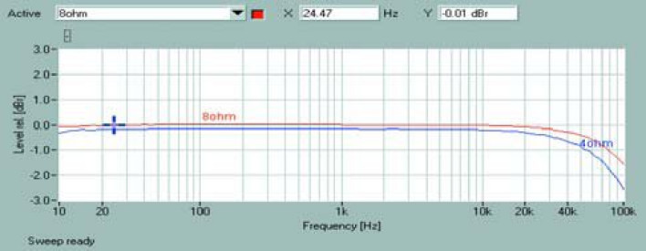 Dla 4 omów nie następuje już duży wzrost, ale 2 x 55W to i tak zauważalny bonus. Czułość wynosi 0,49 V, podobnie jak w NAD jest niższa od standardu dla wzmacniacza zintegrowanego. Poziom szumów Arcama to 86 dB. Tutaj dynamice udało się przekroczyć barierę 100 dB. Patrząc na rys. 2, nie ma się do czego przyczepić, najsilniejsza - druga harmoniczna występuje przy niskich -90 dB, a najwyższa z nieparzystych - piąta, przy ?98 dB. Aż do 10 Hz Solo Mini idzie jak burza, przy 100 kHz są już widoczne spadki, ale dla obydwu obciążeń mniejsze niż -3 dB (rys. 1). Zniekształcenia w całym zakresie są bardzo niskie i nie przekraczają 0,1% (naturalnie poniżej progu przesterowania), co więcej, w obszarach 7-31 W dla 8 omów oraz 11-43 W dla 4 omów THD+N przyjmuje nawet wartości poniżej 0,01% (rys. 3).