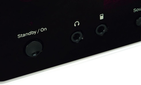 Na przednim panelu są dwa gniazda mini-jack: jedno to wyjście słuchawkowe, drugie pozwala na podłączenie urządzenia przenośnego.