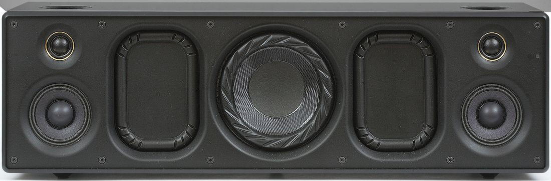 Sekcja 2.1 z przodu – dwudrożne układy dla każdego kanału wspomagane wspólnym wooferem z dwoma membranami biernymi.