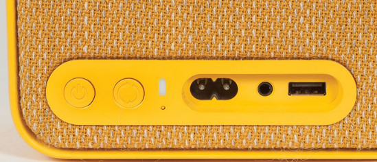 Wyposażenie Copenhagen obejmuje: przyciski do zmiany siły głosu i lampkę statusu połączenia (z przodu), gniazdo sieciowe, wejścia USB i mini-jack, włącznik sieciowy i przycisk do wyszukiwania połączeń (z tyłu).