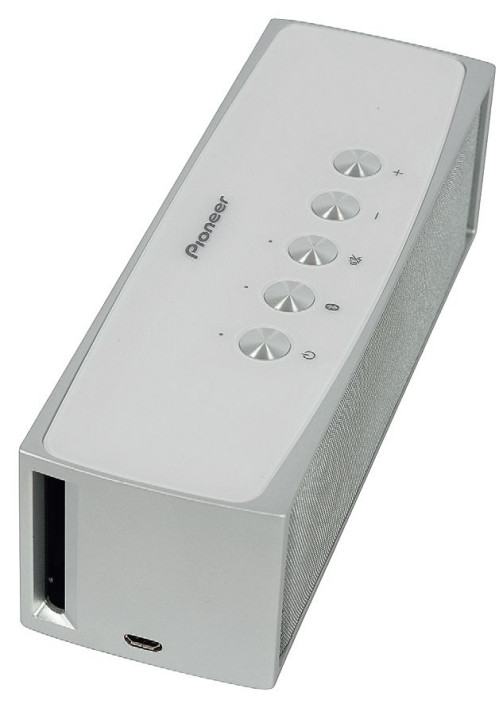 Głośniczek bluetooth Pioneer XW-BTSP70 jest maleńki; waży tylko 740 g. Dwa 4-cm przetworniki szerokopasmowe są zakryte metalową siatką; po bokach znajdują się podłużne otwory - można podejrzewać, że to bas-refleksy, ale XW to kolejna w tym teście konstrukcja z membranami biernymi, zainstalowanymi z tyłu; tyle że ciśnienie wychodzi właśnie tymi szczelinami.