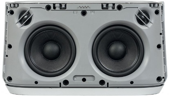 Pod maskownicą znajdziemy tylko dwa, ale szerokopasmowe przetworniki o średnicy 7,5 cm. Można przypuszczać, że każdy ma wydzieloną niezależną komorę (blok elektroniki zainstalowany jest pośrodku). Z tyłu widać dwa otwory bas-refleks.