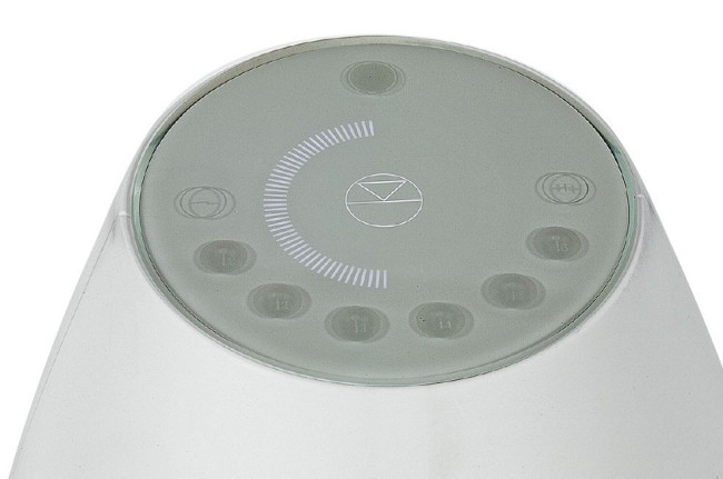 Górną krawędź obudowy delikatnie ścięto (tak, by lekko opadała w stronę przedniej ścianki). Pod szklaną płytą znajduje się wskaźnik diodowy (przede wszystkim poziom głośności) i kilka sensorów dotykowych. Stabilność całej konstrukcji zapewnia podklejony od dołu, gumowy pierścień.