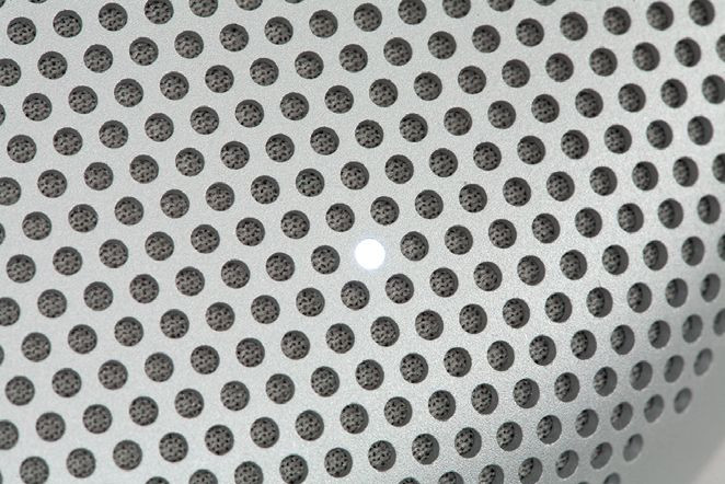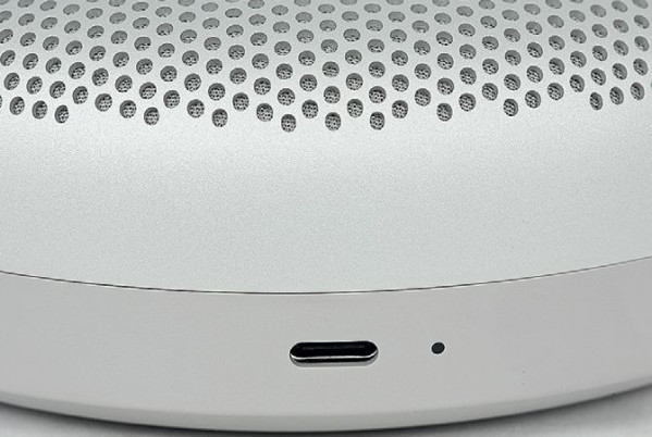 Na dole znajduje się też złącze USB-C do ładowania akumulatorów, a te pozwolą aż na 18 godzin zabawy. Dolna połówka obudowy Bang & Olufsen A1 2GEN jest z gumowanego tworzywa, górną pokrywa perforowany metal, a jedno z siateczkowych "oczek" kryje wielofunkcyjną diodę.
