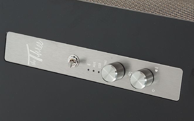 Obudowa Klipsch The Three II jest kanciasta, z elementami drewnianymi (w testowanej wersji polakierowanymi na czarno, dostępnymi też w bardziej klasycznej, naturalnej wersji orzechowej), maskownica z grubego, plecionego dwoma kolorami materiału, a na górze zobaczymy srebrną płytkę z hebelkowym włącznikiem zasilania i parą pokręteł (regulacja głośności i wybór źródeł – jak w normalnym wzmacniaczu); te elementy są metalowe, duża frajda.
