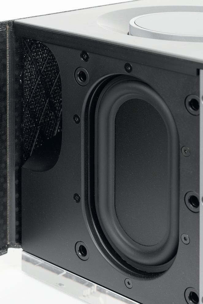 W dolnej części znajduje się wspólny dla obydwu kanałów przetwornik niskotonowy z owalną membraną. Kompletny układ zajmuje niemal całą powierzchnię frontu, a na bokach jest jego ciąg dalszy – owalne membrany bierne.