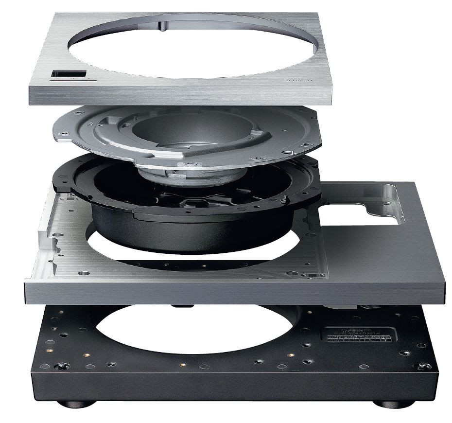 Plinta jest bardzo ciężka, chociaż nie obejmuje zasilacza, który stanowi oddzielną jednostkę. Z dna pudła wyciągamy talerz; element ten wygląda podobnie jak w tańszych SL-1200 i jego klonach, jednak i on okazuje się zaskakująco gruby i ciężki - waży blisko 8 kg (ok. dwukrotnie więcej niż z SL-1200G).