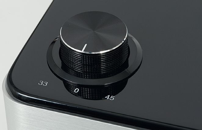 Silnik załączamy okrągłym manipulatorem, który służy też ustawieniu prędkości obrotowej: 33,3 oraz 45 obr./min. Rolka prowadząca jest więc pojedyncza, a napęd – tradycyjnie paskowy.