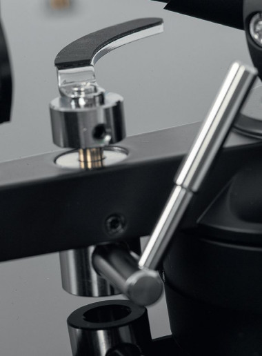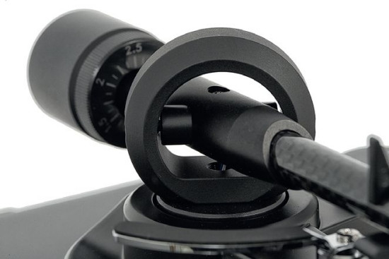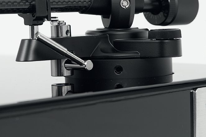 Obok widać zintegrowany, wygodny (pokrętło) system regulacji anti-skatingu. Na najniższym poziomie platformy ramienia znajdziemy też system śrub blokujących do regulacji parametru VTA.