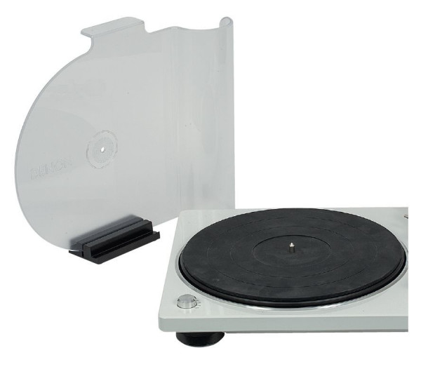 Silnik jest jednak zbyt słaby, aby ruszyć talerz z pokrywą, co jednak nie rozwiązuje problemu – być może ulegnie uszkodzeniu, gdy nieopatrznie włączymy gramofon. A gdzie odstawić osłonę (bo nie jest mocowana na zawiasach)? Jest specjalna podstawka, która może podtrzymać też okładkę płyty.
