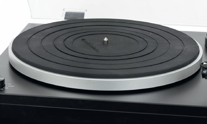 Talerz jest metalowy, Audio-Technica wykorzystuje go również w innych modelach, o czym świadczy wewnętrzny kołnierz przygotowany dla napędu paskowego.