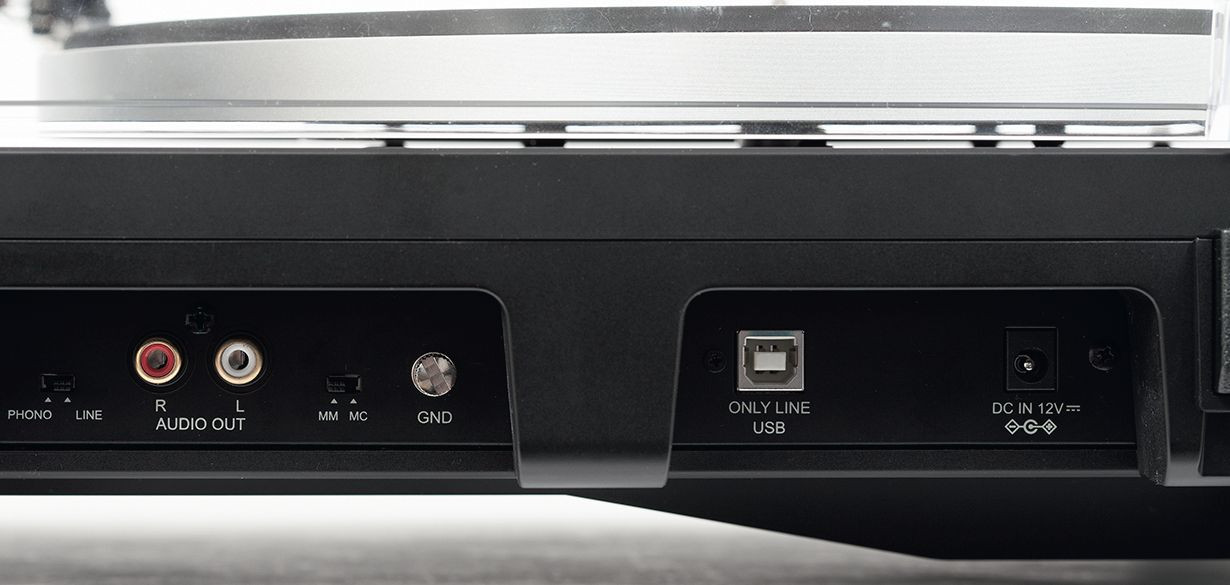 Z tyłu plinty, w zagłębieniu, przygotowano wygodne gniazda RCA, przełącznik trybów pracy przedwzmacniacza korekcyjnego, złącze zasilające i wyjście cyfrowe USB.