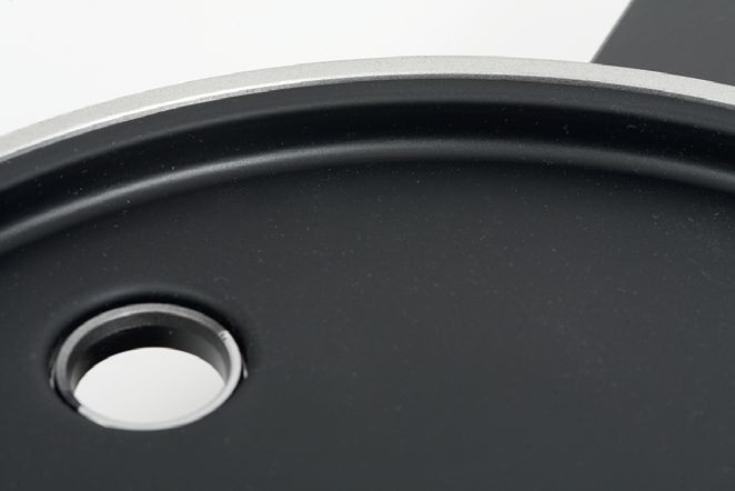Talerz to solidny, aluminiowy odlew, wewnętrzną stronę podklejono warstwą gumy, co jednocześnie wprowadza tłumienie drgań, materiał zwiększa również masę talerza. W zestawie otrzymujemy grubą gumową matę.