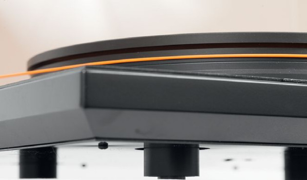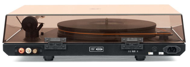 Pomarańczowy pasek efektownie oplata talerz, bez elementów pośrednich. Talerz jest dość wysoki, dokładnie 33-mm, w zestawie nie ma maty, ale w tym przypadku nie jest absolutnie konieczna. Wzmacniacz podłączamy do wysokiej jakości gniazd RCA (jest też trzpień uziemiający). Elektronikę zasilającą wbudowano w podstawę.