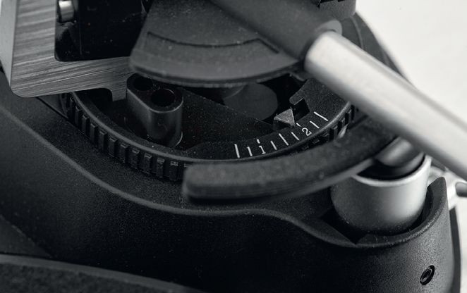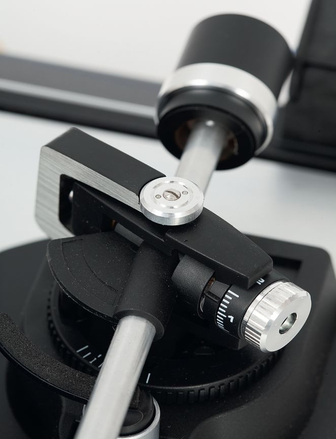 Ramię jest wprawdzie wyposażone w tradycyjny krążek przeciwwagi (nawet z wewnętrzną tulejką tłumiącą drgania), ale służy on tylko do wstępnej kalibracji. Ostateczną siłę nacisku ustalamy dokładnie za pomocą dodatkowego pokrętła (wraz z systemem obciążeń) zainstalowanego w sekcji górnego korpusu.