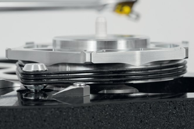 Silnik prądu zmiennego jest osadzony w plincie i przekazuje paskami obroty na niewielki, wewnętrzny subtalerz. Oś subtalerza znajduje się blisko osi silnika (dzięki temu elementy napędu są całkowicie zasłonięte). Paski są aż trzy, równoległe, od ich jakości zależy poziom zniekształceń W&F (drżenie i kołysanie dźwięku), które paskowe trio ma minimalizować.