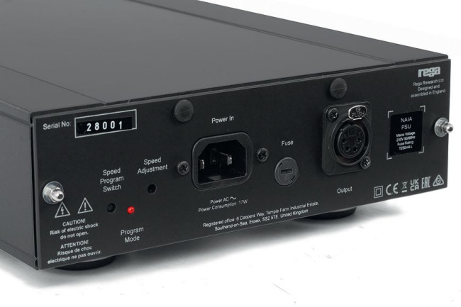 Zewnętrzne zasilacze to w przypadku wielu gramofonów standard, ale w przypadku Regi – w bardzo zaawansowanym wariancie. W zestawie pojawia się dość duża, elegancka skrzyneczka z metalową obudową, jej charakterystyczny wygląd znamy z innych urządzeń firmy (jest podobna choćby do integry Brio). Trzy przyciski na froncie służą do włączania i wyłączania urządzenia oraz zmiany prędkości obrotowej (standardy: 33,3 oraz 45 obr./min).