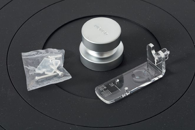 W zestawie oprócz "drobiazgów" kalibracyjnych jest jeszcze elegancki docisk płyty – co zdarza się obecnie bardzo rzadko – może się on przydać, a w gramofonie wysokiej klasy powinien być obowiązkowo. Poprawia dokładność obrotów i precyzję odczytu informacji z płyty, nie tylko ją stabilizując, ale również zwiększając masę talerza.