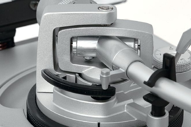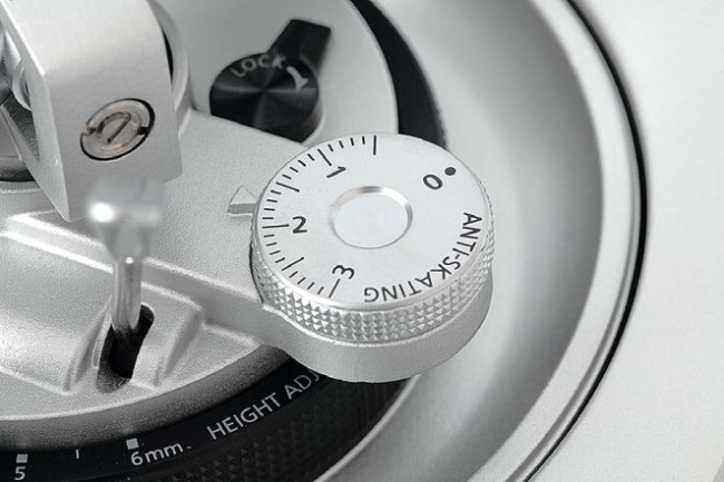 Siłę nacisku igły regulujemy klasyczną przeciwwagą, a wygodne pokrętło na bocznej platformie umożliwia precyzyjne ustawienie anti-skatingu. W dolnej części ramienia znajduje się masywny pierścień do regulacji wysokości głównej kolumny (wraz z blokadą) – to sposób na korekcję kąta VTA.