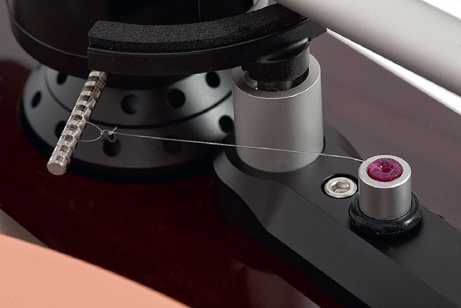 System anti-skatingu opiera się na mechanizmie ciężarka z żyłką, uznawanym za najdokładniejszy. Zawieszamy go na trzpieniu z kilkoma wypustkami (wybór właściwej to wybór pożądanej siły), ale aby przypadkowo nie strącić ciężarka, wsuwamy go (wraz z ochronną tuleją) w specjalną kieszonkę w dolnej części korpusu ramienia. Kolejny dobry pomysł.