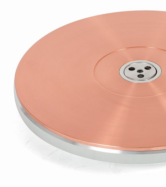 Talerz Thorensa TD 124 DD 140th Anniversary wygląda imponująco. Do aluminiowego "rdzenia", będącego talerzem w standardowym (współczesnym) TD 124 DD, ważącym 3,5 kg, dołożono 5-mm miedzianą płytę, na którą możemy już bezpośrednio położyć winyle.