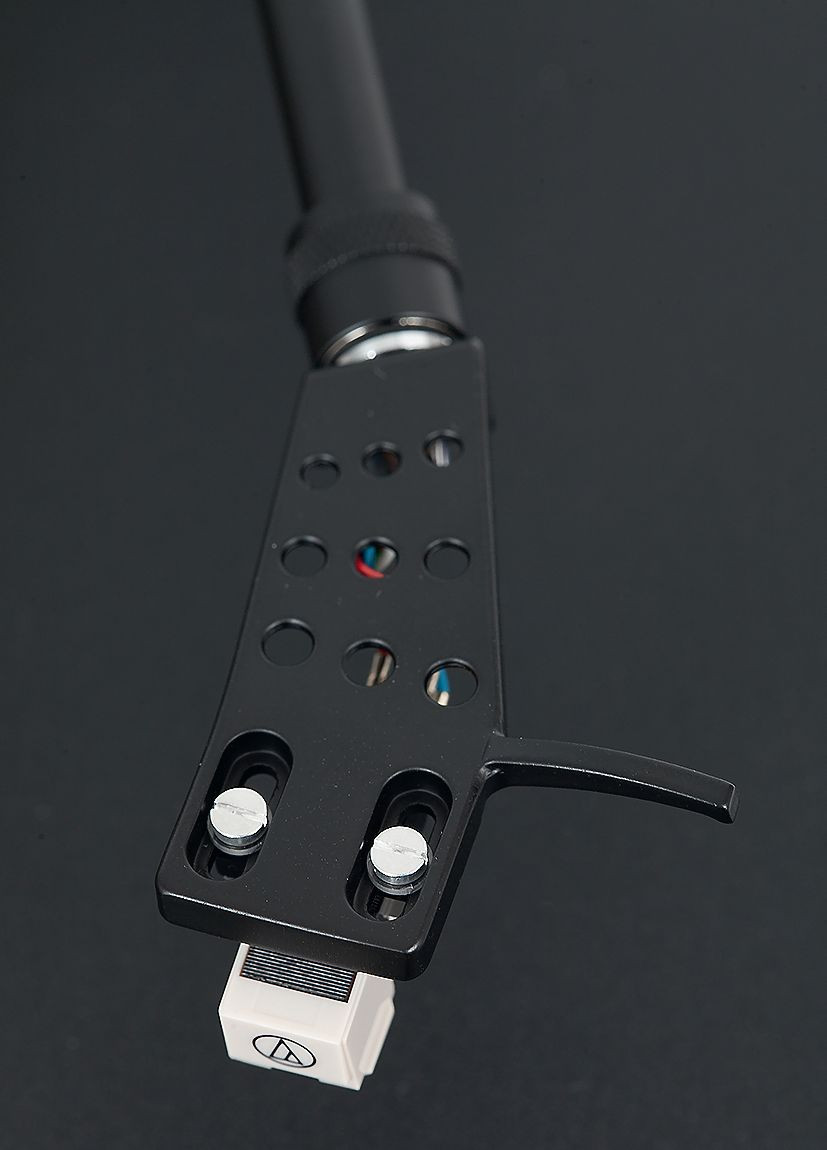 Ramię to prosta aluminiowa rurka zakończona gniazdem; kątowa główka ma zainstalowaną fabrycznie wkładkę – popularny model AT3600L (typu MM) z charakterystyczną, białą obudową igły o podstawowym, stożkowym profilu.