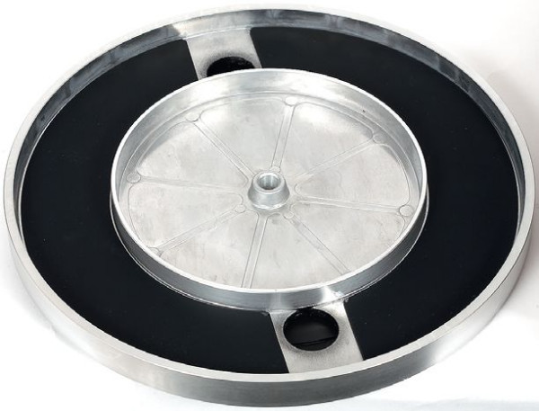 Jest też kołnierz subtalerza; w tym przypadku oczywiście zbędny, skoro JBL TT350 jest konstrukcją bezpośrednią. Talerz jest więc prawdopodobnie elementem "uniwersalnym", znajdującym zastosowanie również w gramofonach z napędem paskowym. Mata jest gumowa i dość gruba (z licznymi przetłoczeniami, tutaj również odwołano się do klasyki).