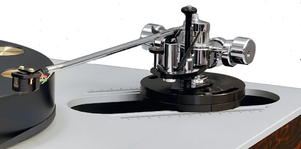 Sloty mają naniesioną na brzegach precyzyjną podziałkę, więc montaż lub wymiana ramienia jest łatwa i może być bardzo precyzyjna. Gramofon stoi na trzech aluminiowych nóżkach z elementami z miękkiej gumy, którymi regulujemy poziom.