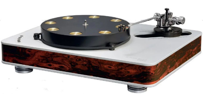 Żeby zwiększyć moment zamachowy, blisko jego obrysu wyfrezowano duże otwory, w które wciśnięto mosiężne, widoczne od góry walce. Podobną technikę, tyle że z walcami "podwieszonymi" pod talerzem, przed wielu laty do audio wprowadziła firma Michell Engineering. Od góry na talerz jest nakręcany krążek dociskowy z aluminium. Jego spód pokryto lakierem firmy M3, poprawiającym kontakt z płytą.