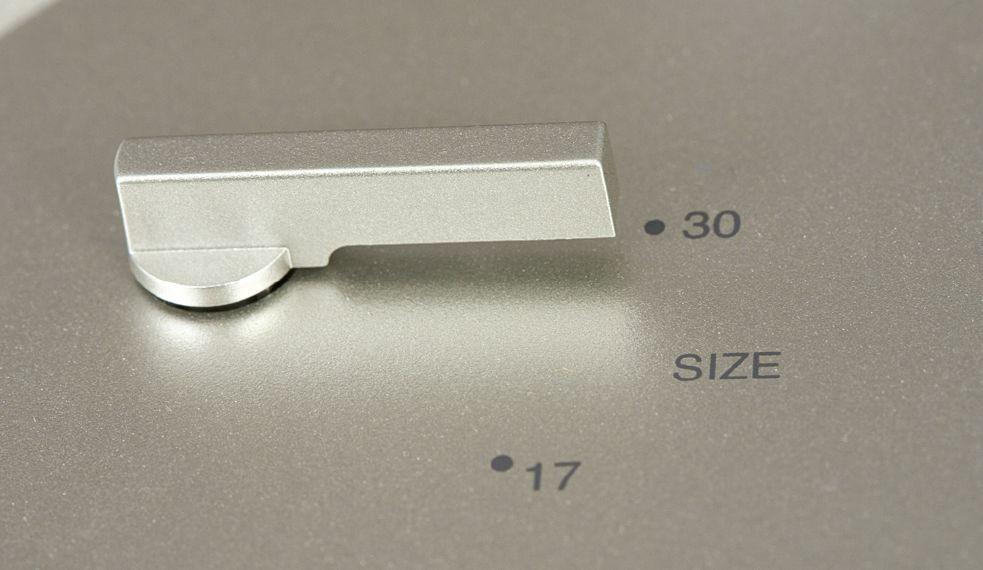 Wydawać by się mogło, że trochę to niewygodne, bo ilekroć zechcemy zmienić tryb, trzeba będzie zdjąć talerz (i rozpiąć pasek napędowy). Nic jednak bardziej mylnego, bowiem przełącznik trybu pracy zainstalowano w takim miejscu, że dostęp do niego umożliwia "okienko" wycięte w talerzu - dokładnie to samo, które umożliwia zainstalowanie paska.