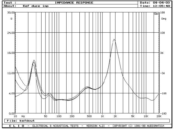 Ciekawa jest również sytuacja w zakresie niskich tonów. Widać tam trzy nieco rozchodzące się charakterystyki, przynależą one do trzech pozycji regulatora niskich częstotliwości. Wprowadza on do obwodu głośnika niskotonowego działający dwustopniowo filtr górnoprzepustowy tylko w pozycji ”lift” jest on nieaktywny. Nie jest jednak efektem jego działania spłaszczenie drugiego wierzchołka, który powinien pojawić się na skutek działania systemu bass-reflex (jego pozostałości widać przy 60Hz), wtrącono więc też obwód linearyzujący przebieg impedancji w tym zakresie.