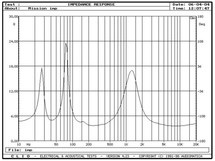 m34 to konstrukcja o impedancji znamionowej 4 omy, z minimami leżącymi na poziomie ok. 3,5 oma, zarówno w zakresie 200-300Hz, jak i wysokich tonów (co ma już jednak mniejsze znaczenie - rys. 1). Jednak czerpiąc sporo prądu ze wzmacniacza, m34 rewanżuje się wysoką efektywnością, nie ustępując na tym polu nawet Tobago - osiąga bowiem wynik 89dB.