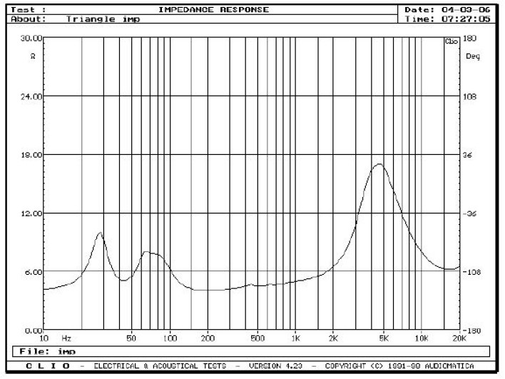 Swoim i nie tylko swoim zwyczajem, bo to już bardzo częsta praktyka, Triangle przedstawia 4-omowe kolumny jako znamionowo 8-omowe. Że naprawdę są 4-omowe, potwierdzają nie tylko nasze pomiary (rys. 1), ale i sam producent, który w rubryce "minimum impedancji" podaje właśnie wartość 4Ω. A minimum to pojawia się przy 200Hz. Czy z tego jednoznacznie nie wynika, że impedancja znamionowa to 4Ω? Od jakiegoś czasu, zdaniem wielu producentów, już nie.