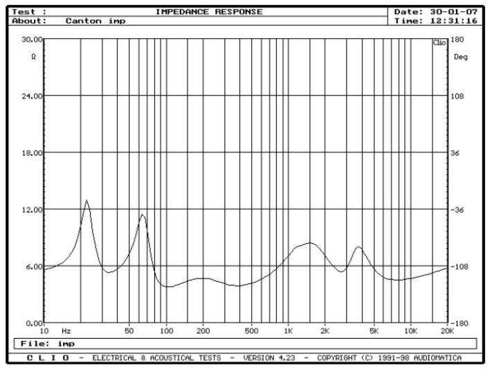 Charakterystyka impedancji (rys. 1) kwalifikuje GLE409 do kategorii 4-omowych zespołów głośnikowych, o czym decyduje przede wszystkim 3,5-omowe minimum przy 100Hz. Zmienność modułu impedancji w całym pasmie nie jest duża, również dwa bas-refleksowe wierzchołki w zakresie niskotonowym mają umiarkowaną wysokość, obciążenie dla wzmacniacza nie będzie duże. Efektywność wynosi 88dB, to wynik dobry, choć spodziewany po tak dużej 4-omowej konstrukcji.