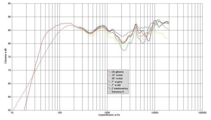 Również w obrębie pomiarów, dla porównania sięgnąłem do wyników, jakie uzyskał dwa lata temu CM1. Także mniejszy model, operujący filtrami 1. rzędu, pokazywał dużą zmienność charakterystyki przetwarzania przy zmianie kąta w płaszczyźnie pionowej, najlepsze wyrównanie pojawiało się pod kątem kilku stopni w górę, a poniżej powstawała zapadłość w zakresie 2-4 kHz. W CM5 jest podobnie a zarazem inaczej - na osi głównej, a tym bardziej na osi -7 mamy osłabienie przy ok. 2-3 kHz, na osi +7O zakres ten wypełnia się, lecz pojawia się dołek przy 5,5 kHz. W sumie najbardziej fizjologicznie wygląda przebieg z osi głównej i pod kątem 15O w płaszczyźnie poziomej, najlepiej bez maskownicy, która mimo że cienka, wywołuje jednak wyraźne perturbacje w zakresie wysokotonowym.