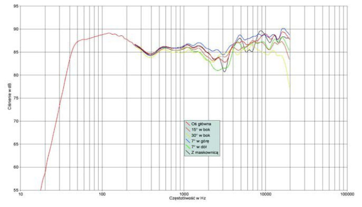 Poziom niskich tonów znajduje się nieco powyżej zakresu średniotonowego, widać też osłabione przejście przez częstotliwość podziału, ale to zjawisko często spotykane i do pewnego stopnia tolerowane przez słuch, a tutaj nie przybiera rozmiarów kłopotliwych, zresztą głębokość tego osłabienia zależy od wysokości osi pomiaru.